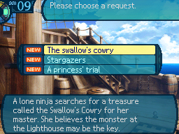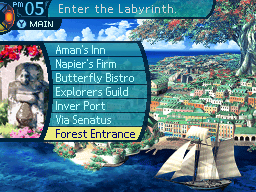 Within the Labyrinth players are guided by a map, which can be customized with points of interest, directions, etc. using the DS stylus. Once monsters are encountered, turn-based combat begins, with the five party members arrayed in a line of three in front and two in back, or vice versa, and with support/healing as well as ranged attacks possible from the rear. If a character in the vanguard falls, one from behind assumes that position on the line. Players dictate in advance how individual characters respond in combat, and with victory in combat can use the individual skill points characters earn to level up specific abilities and attributes. An additional new feature allows for players to take to the high seas. Here they can explore, fish and battle new monsters for as long as provisions are available for the crew.Key Game Features